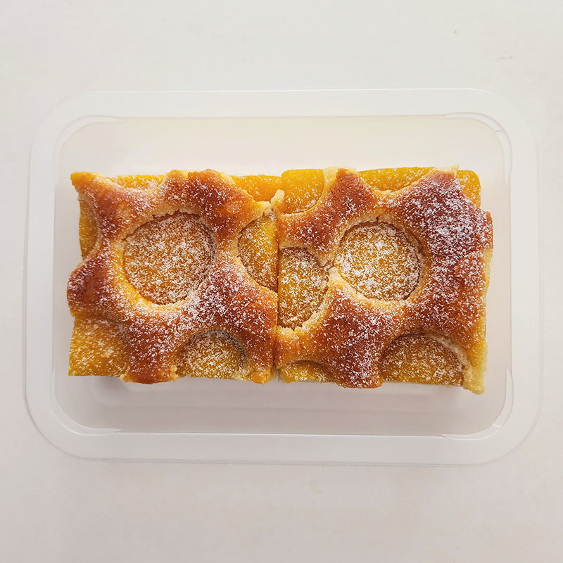 A soft, golden cake made with juicy tinned apricots and apricot nectar, lightly sweetened and baked with vanilla. Finished with a delicate dusting of icing sugar for a perfectly balanced, fruity treat.