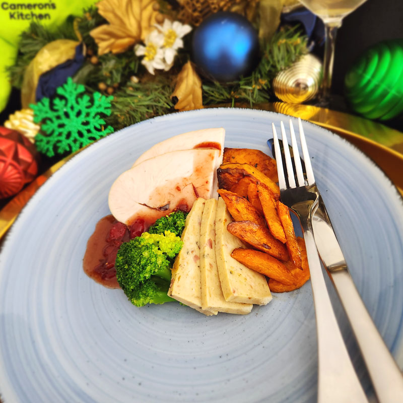 Roasted breast of turkey served with homemade sage & bacon stuffing, roasted carrots & pumpkin, broccoli, and cranberry sauce.