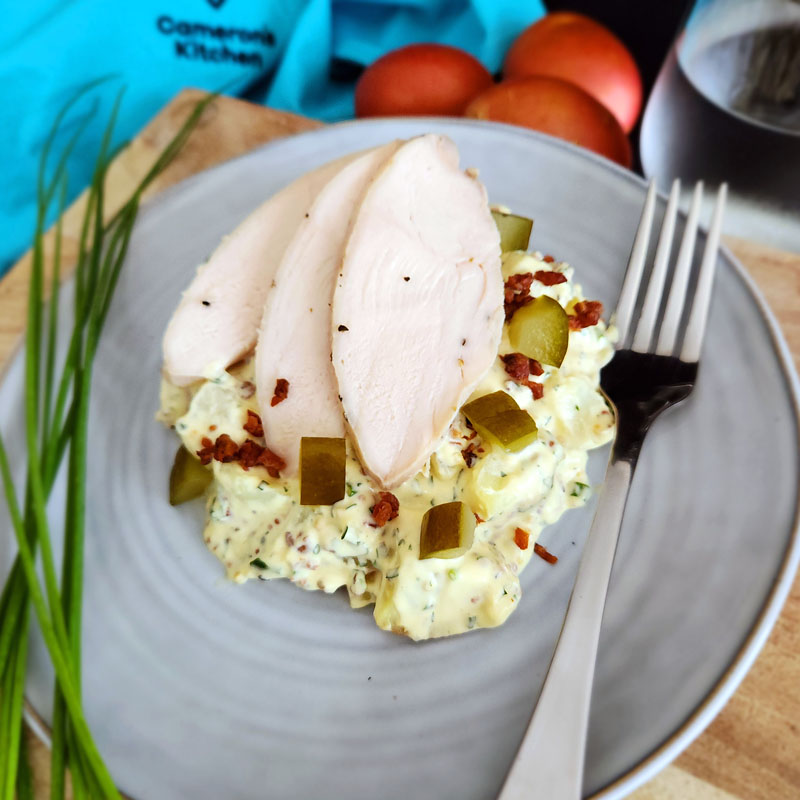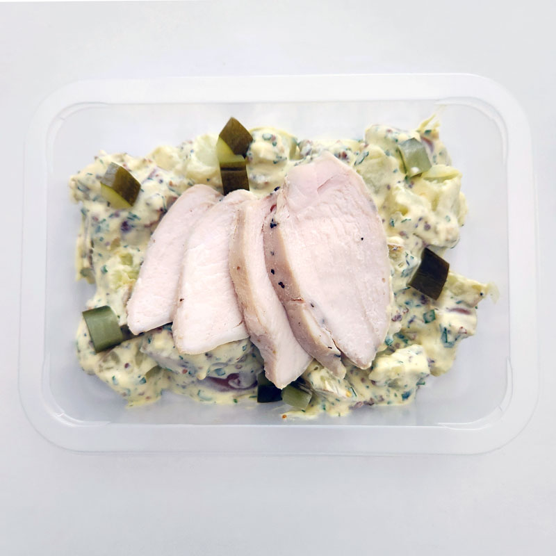 Tender potatoes tossed in a rich dressing of sour cream, mayonnaise, crispy bacon, and herbs. Topped with sliced, poached chicken breast and tangy house-made pickles for a satisfying mix of creamy, smoky, and bright flavors.